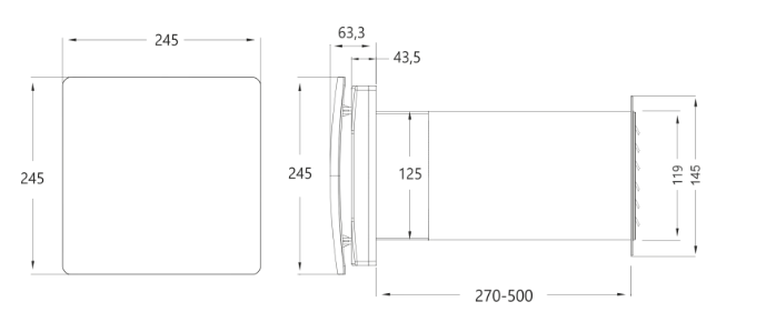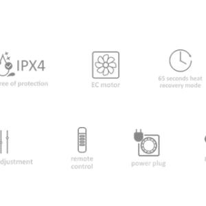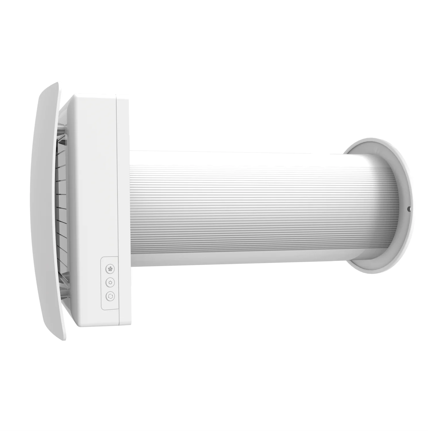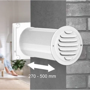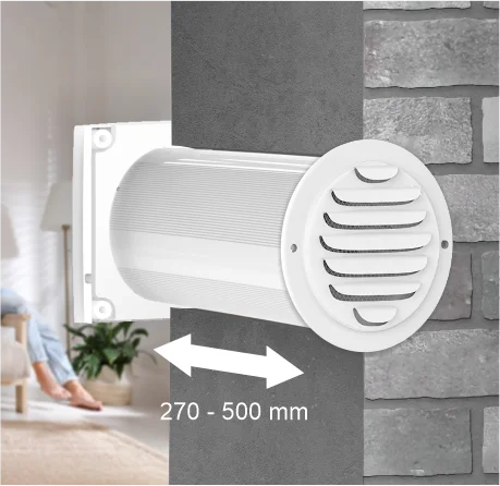 Designed for wall-mounted installation, its telescopic construction allows installation in walls with a thickness ranging from 270 mm to 500 mm. The fan is powered via a 90 cm power cable with plug and is conveniently controlled using a remote control.