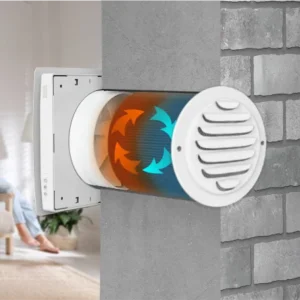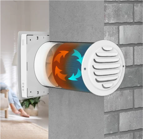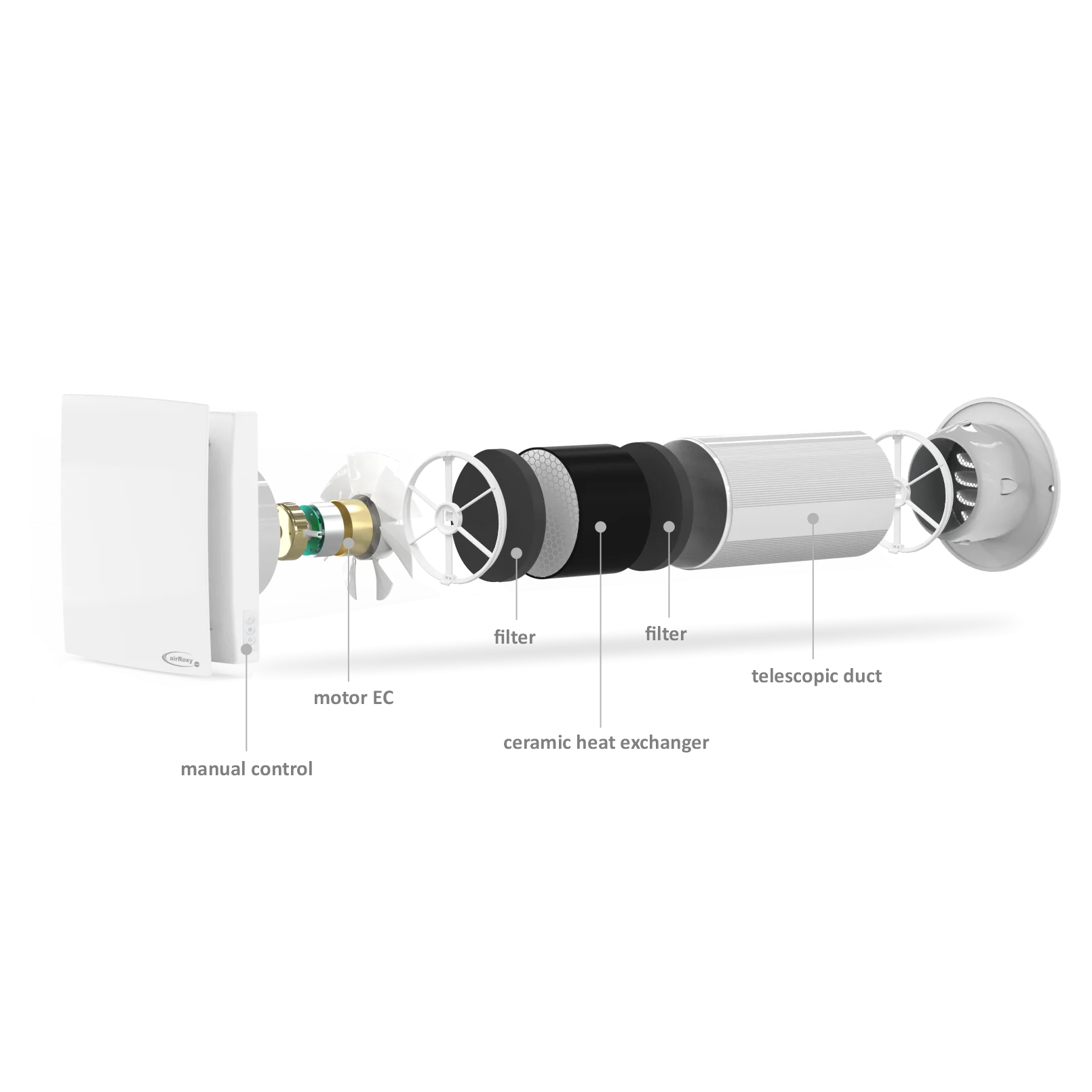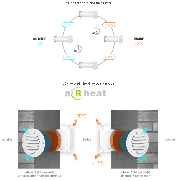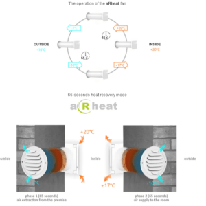 The aRheat wall-mounted heat recovery unit is designed to provide continuous, controlled ventilation with heat energy recovery, ensuring a constant supply of fresh air while minimizing heat losses. It is equipped with an axial fan and a ceramic heat exchanger, allowing efficient air exchange between indoor and outdoor environments.