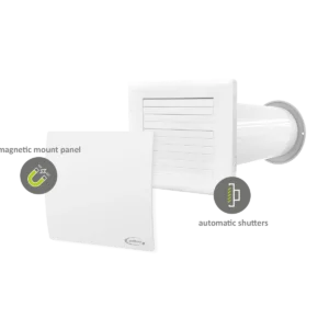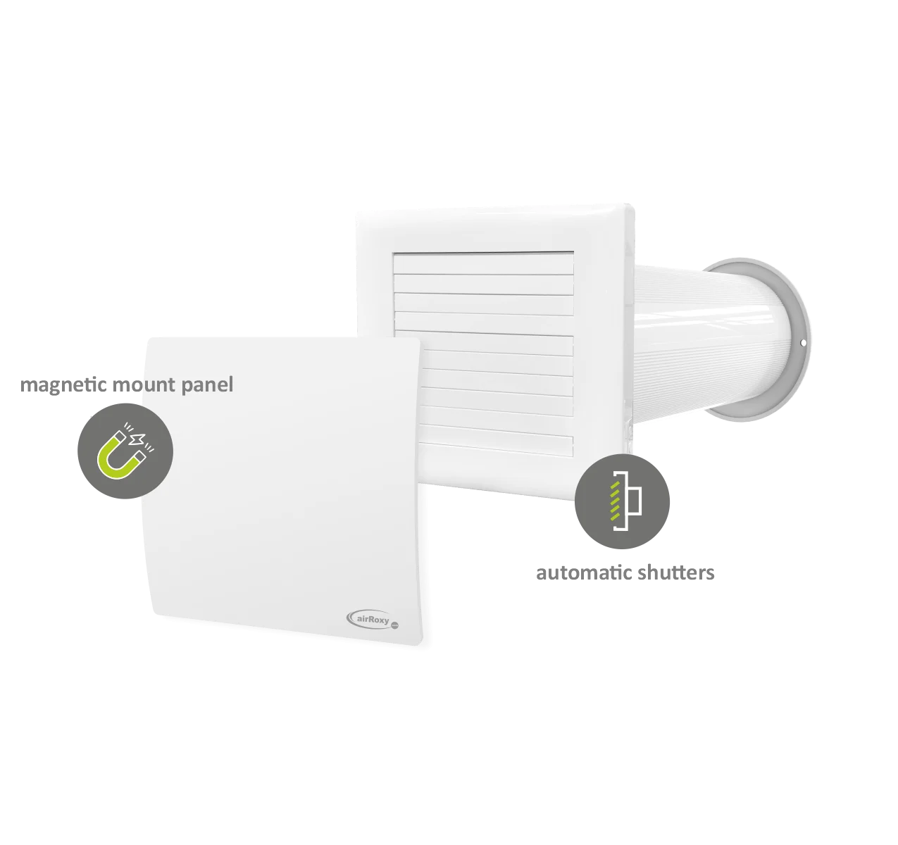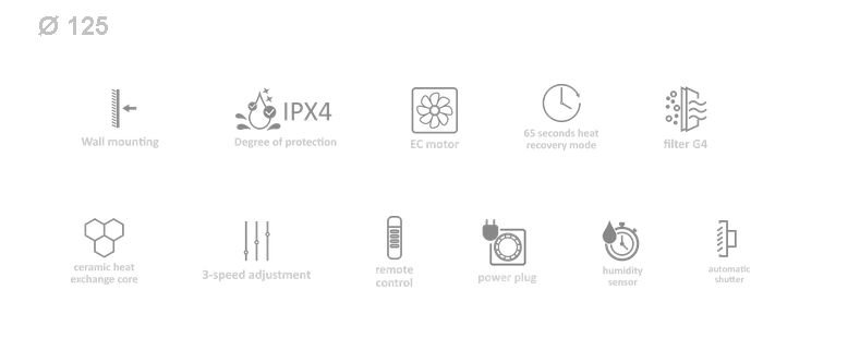 The aRheat 125 version features an automatic shutter that prevents the backflow of cold and humid air into the room. The shutter closes automatically approximately 3 minutes after the fan is switched off. This version is also equipped with a built-in hygrostat, which, when activated, automatically increases the fan speed when humidity levels rise (50%, 60%, or 70%).