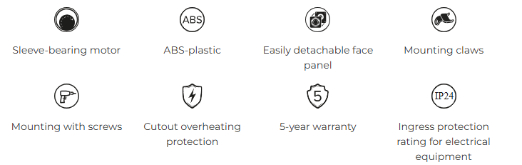 Made of high-quality ABS plastic, the housing, impeller, and front panel are resistant to discoloration and built to last. With IP24 protection, the fan is suitable for humid environments, and installation can be done with either the supplied brackets or screws.