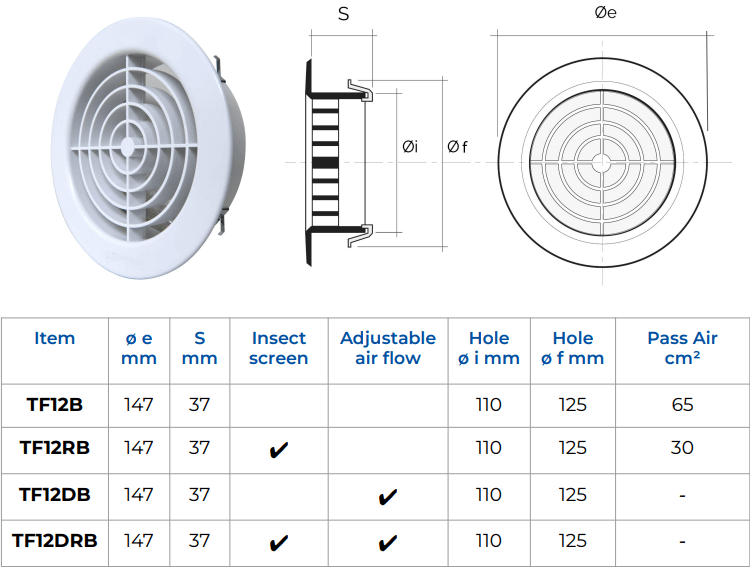 Recessed mounting round grill with flat flaps TF12DRB, Ø125, white